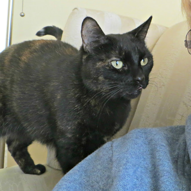 I don't know if you can tell by the photos, but she is a tiny cat, about half the size of Purl. She's the same age, though, turning 7 years old next month. Here's hoping someone wonderful applies to the animal rescue group to adopt her. Not everyone considers taking in a more mature animal, but we had a 14-year-old dog adopted today, so there is reason to be hopeful and look on the sunny side of possibilities.